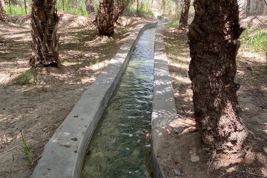 Die Oase ist berühmt für ihr unterirdisches Bewässerungssystem (Falaj oder Qanat), das Wasser aus Bohrlöchern zu den Feldern und Palmen leitet. Die Falaj-Bewässerung ist ein Jahrtausende altes System, das in Oman, den Vereinigten Arabischen Emiraten, Indien, Iran und anderen Ländern weit verbreitet ist.