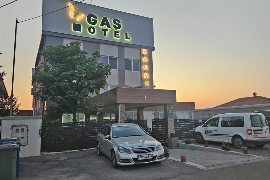 Um die erste Tagesroute erträglich zu lassen buchten wir kurz vor Belgrad das Gas Otel, welches wir auch für die Rückfahrt buchten. Es liegt unmittelbar an der Autobahn. Vorher suchten wir im Voraus uns ein Restaurant aus, um Abendbrot zu essen. Da wir eine Wendestelle zum Hotel brauchten, war das Restautent / Fleischerei kein großer Umweg.