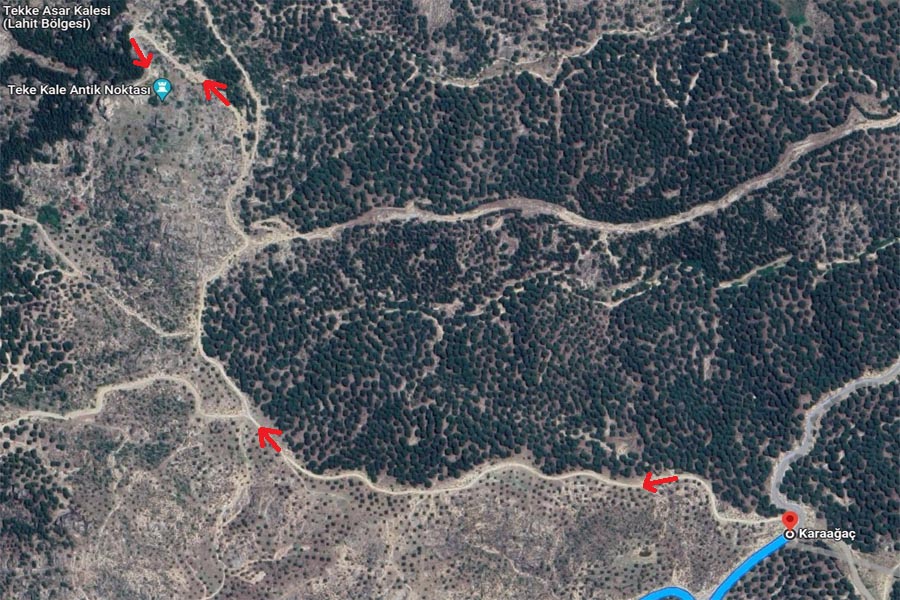Wir fuhren nach Karakaya zurück und folgten der Straße nach Çavdar. Dort bogen wir nach links in südlicher Richtung ab und erreichten Bağarcık. Im Ort Bağarcık bogen wir am Punkt (37.541096, 27.633305) links ab und folgten den unbefestigten Weg etwa 1,5 Kilometer in nordwestlicher Richtung und erreichten die Reste des Tempels auf den Bağarcık Kale nach 22 Kilometer bei einer Fahrzeit von fast 45 Minuten.