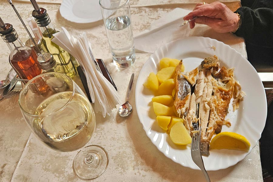 Vorbestellt wurde gebratene Forelle (aus eigener Fischzucht) mit Salzkartoffeln und als Nachspeise abgetropfter bulgarischer Joghurt mit Blaubeerkonfitüre, Brot und eine Flasche Mineralwasser zum Preis von 25 Lewa gereicht.