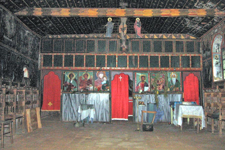 Die Decke und die Ikonostase sind mit Holz verkleidet und in leuchtenden Farben – Sterne, Blumen usw. – geschmückt. Die Ikonen im Tempel stammen von Vertretern der Samokow-Schule und sind die frühesten Renaissance-Ikonen des Rila-Klosters; sie entstanden 1784 und 1789. Derzeit befinden sich die Ikonen nicht in der Kirche.