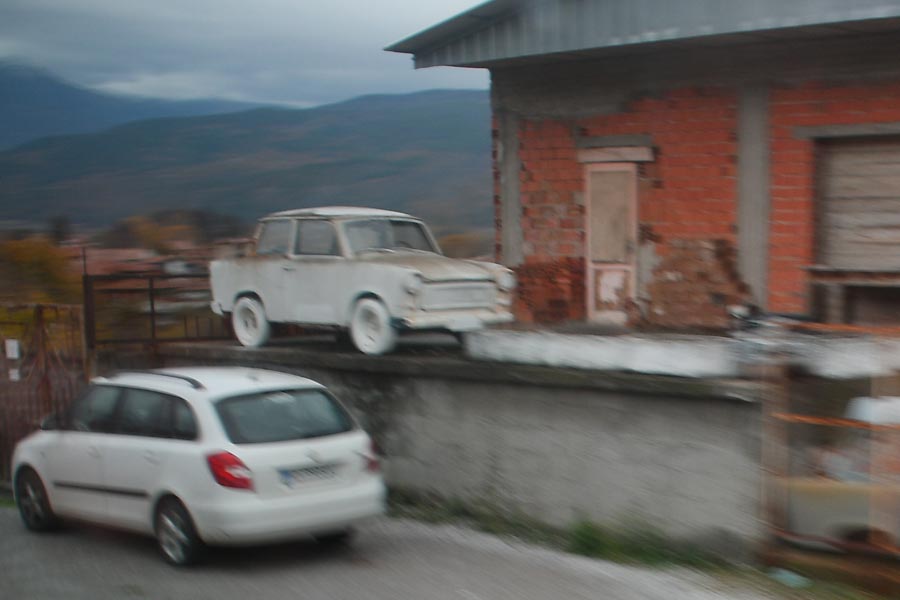 Anschließend fuhren wir über die Oblast Pazardzhik direkt zu unserem Hotel in Plovdiv. In der Ortschaft Dupnitsa passierten wir ein sehenswerts Brückenbauwerk über den Fluss Dzherman. Und was sahen wir da auf der Fahrt, als wir auf der Staatsstraße 107 fuhren? Auf einem Dach war ein Trabant 601 zu sehen, welches ich im letzten Moment aus den Bus fotografieren konnte.