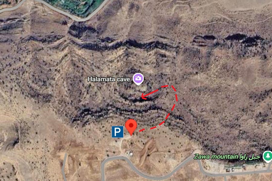 1. Mit dem Auto fährt man hinter das Sheraton Hotel, in der Nähe von Jabal Zawa. Nach einer kurzen Strecke gibt es einen Feldweg. Am Ende der Straße lässt man das Auto stehen und geht hinauf.