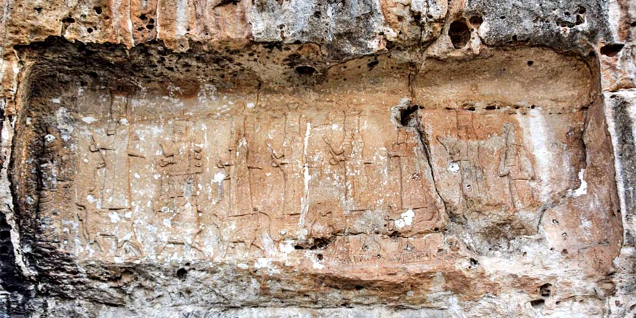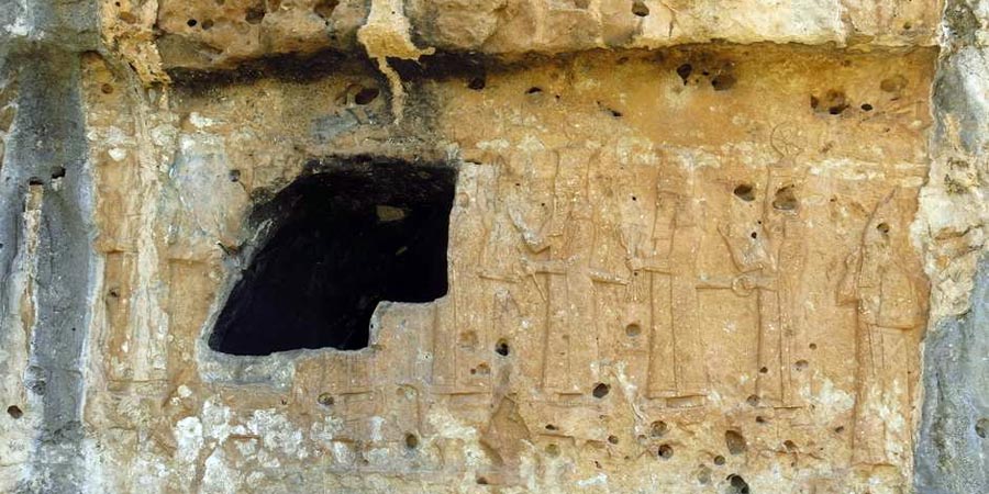 Man parkt das Fahrzeug südlich des Felsreliefs (36.838777, 42.944547) , geht etwa 60 Meter in nordöstlicher Richtung zu einer Tafel und folgt den rot markierten Pfeilen auf den Steinen.