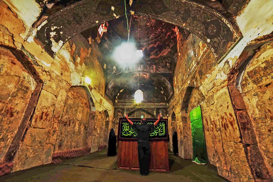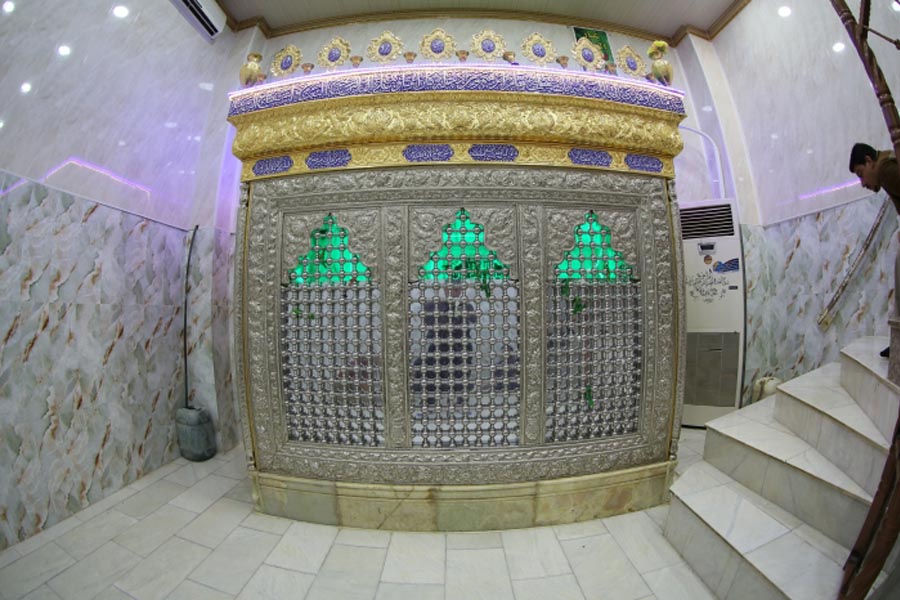 Ibn Battuta besuchte den Schrein 1326 und bemerkte, dass er „mit verschiedenen Arten von Teppichen aus Seide und anderen Materialien ausgelegt war und große und kleine Kandelaber aus Gold und Silber enthielt“. Zwischen den drei Gräbern befanden sich „Schalen aus Gold und Silber mit Rosenwasser, Moschus und verschiedenen Parfums. Der Besucher tauchte seine Hand hinein und salbte sein Gesicht damit, um einen Segen zu erhalten.“ Ein Brand zerstörte den Schrein 1354, doch er wurde um 1358 vom Dschalairiden-Sultan Scheich Awais Dschalair wieder aufgebaut.