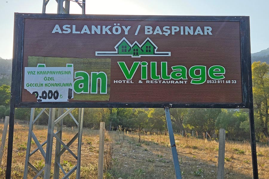 Nur 400 Meter weiter war das bereits vorher ausgeschilderte Aslan Village (Tiny Village - GPS: 36.992188, 34.241612) - Hotel & Restaurant zum Übernachtungspreis von 2000 TL (ca. 42 Euro), welches aber leider geschlossen war.