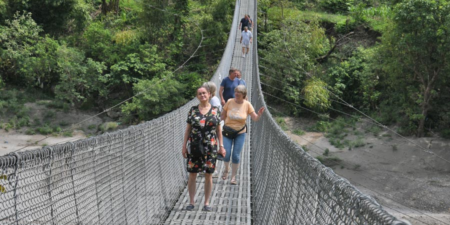 Nach genau einer Fahrstunde stoppte unser Reisebus. Obwohl die Hängebrücke mit Seilen stabilisiert waren, hatten einige Mitreisenden ein mulmiges Gefühl beim Überqueren.