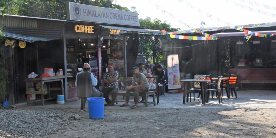 Für drei Kilometer brauchten wir zwei Fahrstunden. So legten wir gegen 17:20 Uhr an der Raststätte Himalayan crema Coffee / हिमालय क्रेमा कफी an der NH03/Tribhuvan Hwy/H02 eine Pause ein.