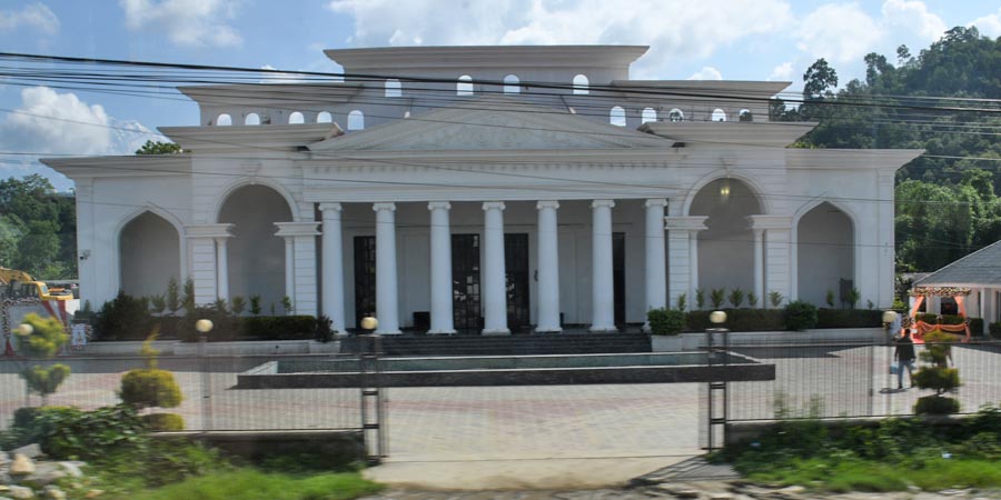 Auf der Fahrt passierten wir ein interessantes Gebäude. Erst einmal im Bild festhalten und später recherchieren, was es ist. Es stellte sich als Veranstaltungsstätte Rabi Mahal Reception in Lekhnath heaus, was ich anhand der GPS-Koordinaten, die auf jedem Foto von mir in den Bilddaten hinterlegt sind, die eine geografische Zuordnung ermöglichen.