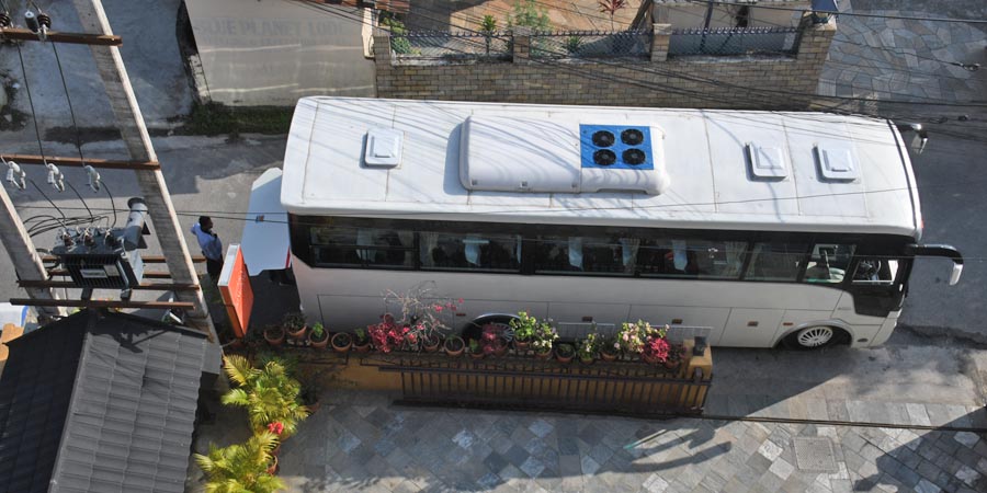 Das Hotel Indreni World verwöhnte uns zu unserer letzen Frühstück in Nepal mit einem außergewöhnlichem Angebot. Gut gestärkt gingen wir gegen 7:30 Uhr zum Bus, der uns zum knapp 5 km entfernten Airport brachte.