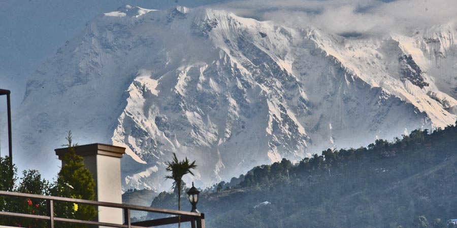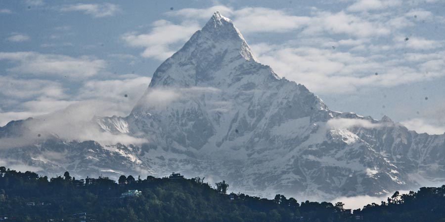 Gleich nach dem Aufstehen galt unser erster Blick aus dem Fenster und wir waren überwältigt. Das Himalaya-Gebirge zeigte sich in bester Pracht bei guter Sicht. Es ist der Gipfel des Machapucharé / माछापुच्छ्रे हिमाल (Kumari Himal) - ein Berg mit einer Höhe von 6997 m des Annapurna-Gebirges im Himalaya. Das Hotel nannte ihn "Hajur".
